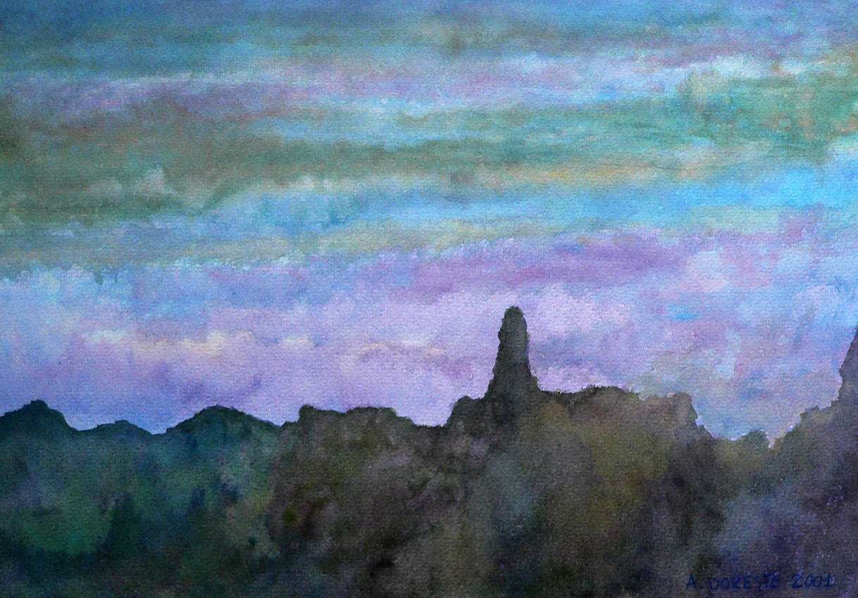 La pintura muestra un paisaje sereno al amanecer, con una silueta oscura de montañas y formaciones rocosas en primer plano. Destaca una figura rocosa al centro que se alza como un monolito solitario. El cielo, lleno de suaves transiciones de color, va del azul al verde y al violeta, evocando una atmósfera tranquila y contemplativa. La técnica empleada es la acuarela, con trazos difuminados que aportan un efecto etéreo y soñador al conjunto.