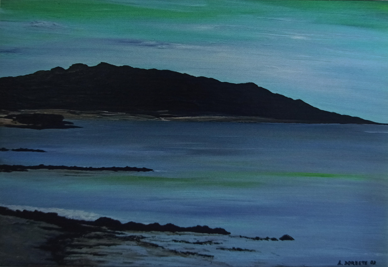 La pintura muestra un paisaje costero en calma, donde el mar sereno ocupa la mayor parte de la composición. En el horizonte se distingue una gran península oscura, de relieve bajo y alargado, que corresponde a la Punta de Jandía, en el extremo sur de Fuerteventura. El cielo se tiñe de suaves tonos verdes y azulados, creando un contraste con la silueta oscura de la tierra. En primer plano, la costa rocosa aparece bañada por aguas tranquilas que reflejan leves matices verdosos y azul claro.