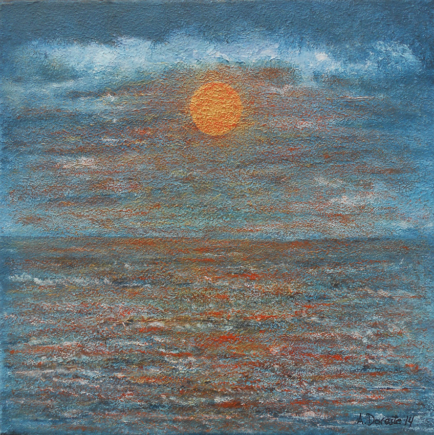Este cuadro es una pintura impresionista de un atardecer en el mar. El sol anaranjado domina el cielo, parcialmente cubierto por nubes azuladas y grisáceas, que difuminan la luz y la reflejan sobre la superficie del agua. El mar, en tonos azules, grises y rojizos, muestra un oleaje suave y lleno de destellos que evocan la calma y la calidez del final del día. La textura espesa de la pintura refuerza la sensación de movimiento y profundidad, como si el espectador pudiera sentir el aire húmedo y la serenidad del momento.