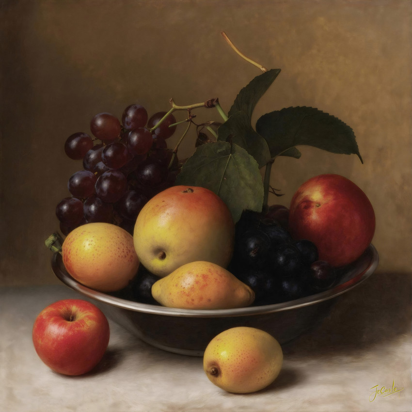La obra transmite una sensación de serenidad y abundancia. La elección de las frutas y su disposición evoca una tradición artística que celebra la belleza de la naturaleza y la vida cotidiana.