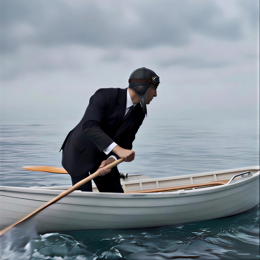 Un aviador descontextualizado boga en solitario sobre un mar infinito e incierto. Ataviado con un traje formal y su casco clásico, rema sin rumbo aparente bajo un cielo plomizo, simbolizando la deriva existencial y la búsqueda de dirección en medio de la nada. Una pieza onírica que explora la soledad y la persistencia del viaje personal.