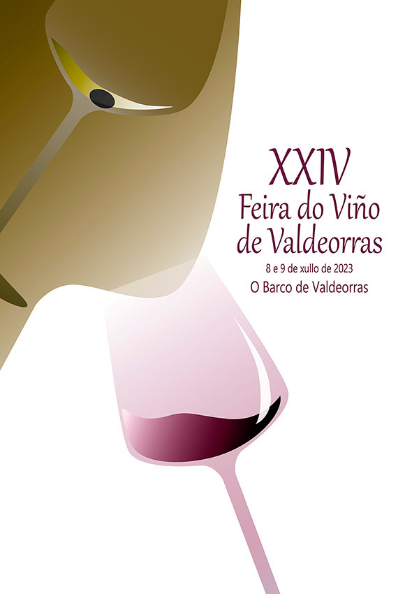 Diseño de carteles para la Feira do Viño de Valdeorras 2023, O Barco de Valdeorras, Ourense. Dos copas de vino que forman una cara haciendo una cata