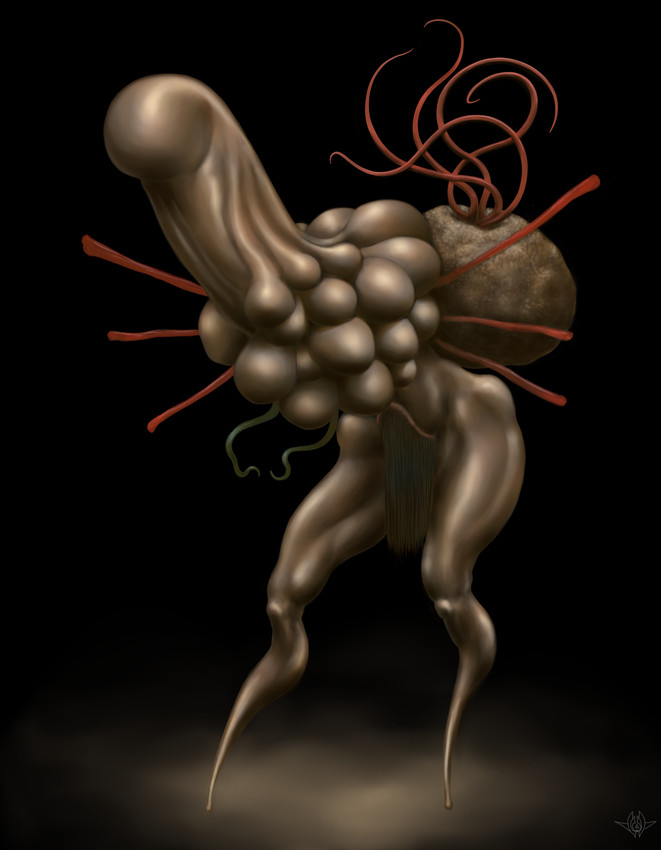 La pieza presenta una figura biomórfica que emerge de un fondo oscuro. El cuerpo, de tonalidades terrosas y bronceadas, exhibe una superficie lisa y brillante, con volúmenes orgánicos que sugieren formas carnosas. Una prominente estructura fálica se fusiona con un racimo de esferas, mientras finas varillas rojas y tentáculos sinuosos del mismo color perforan y adornan el torso. Las piernas, esbeltas y afiladas, culminan en puntas delicadas, aportando una silueta inquietante y dinámica a la composición.