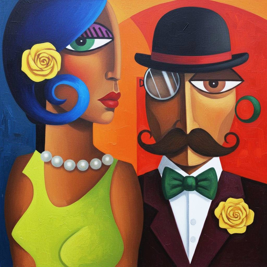 A vibrante e estilizada que apresenta os bustos de um casal, provavelmente inspirada na estética do Cubismo e da Arte Geométrica, características do trabalho de Natalicio Borges Jr. A composição é marcada por cores intensas, linhas fortes e formas simplificadas e geométricas.