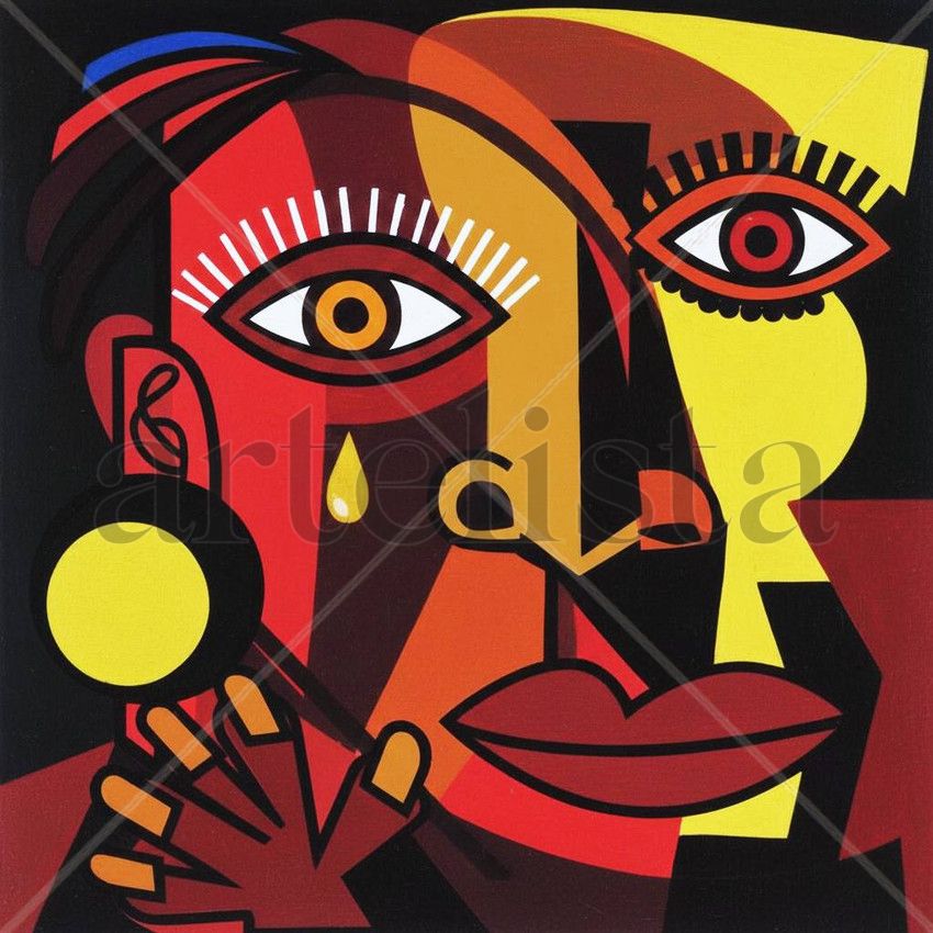 A obra é um retrato ou figura predominantemente feminino, apresentado de forma fragmentada e geométrica. O rosto é composto por planos de cor ousados e linhas de contorno pretas, características que remetem à desconstrução formal do Cubismo. A composição é centralizada, focando em um close-up intenso e emocional.