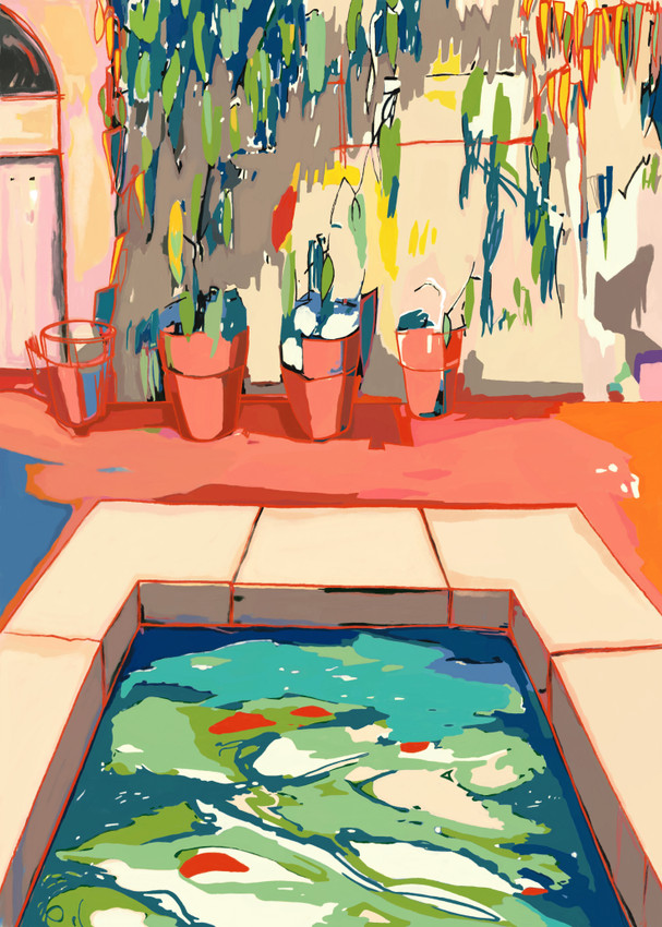Es una vista, un detalle, de una pequeña plaza encontrada en un pueblo paseando en verano, con un estanco en el medio. Todo està inundado de la luz del verano que resalta los colores de las cosas.