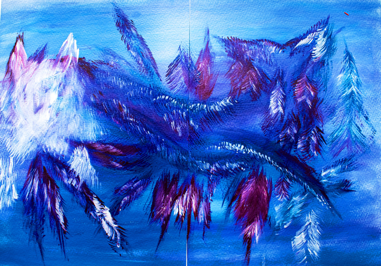 En esta obra, expreso mi visión del mundo, que se presenta todo en tonos azules, como el océano. Las formas de pelos y plumas se entrelazan, creando una imagen que invita a todos a reflexionar.