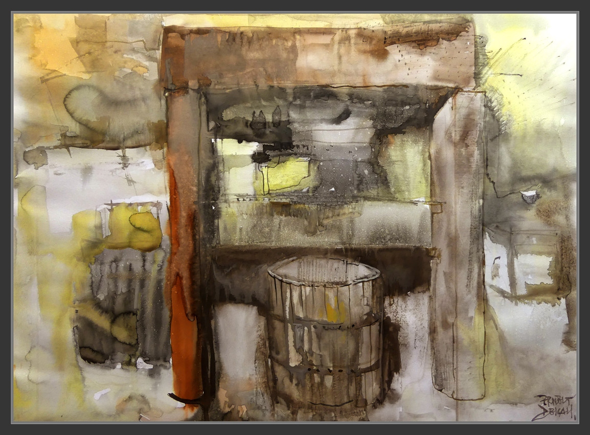 During my travels through the Bages region in the company of my friend Jordi, I visited the Masia de CAL PELFORT in CAMPS, municipality of FONOLLOSA, the old rural house of Jordi's family keeps an interesting collection of jewels from the history of agricultural activities such as this OIL PRESS, a true monument of times gone by that makes me rediscover the essence of work in the field. Watercolor painting on 50 x 70 centimeters paper, a free expression of the structure of wood and stone. I enjoyed painting this historical piece of farming in our home.