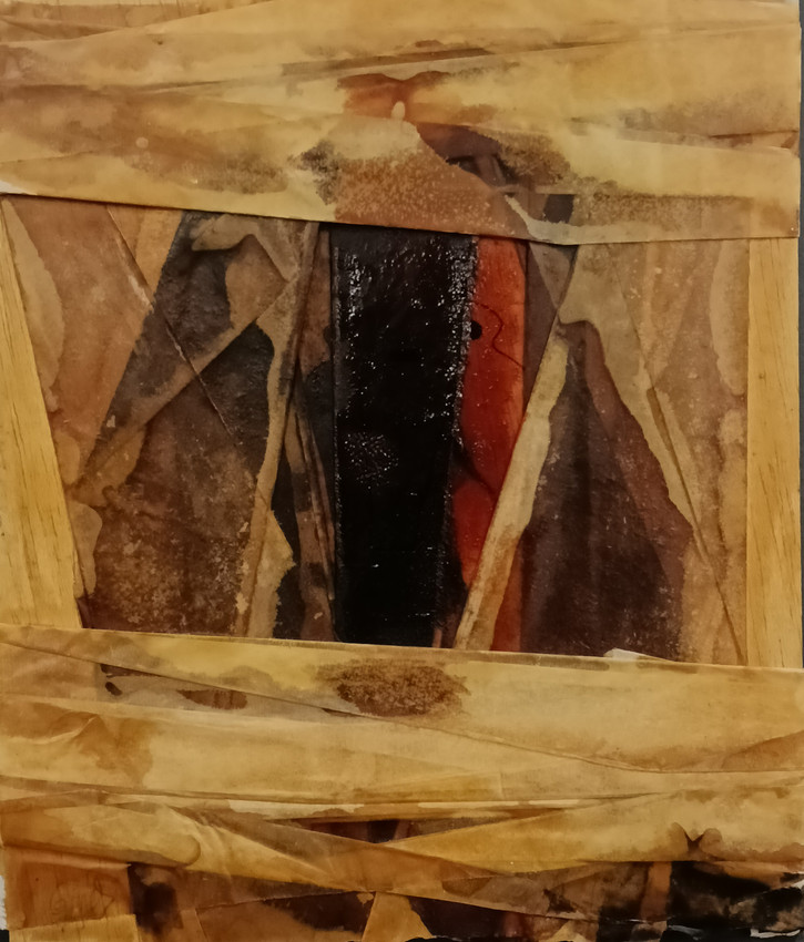Obra de pequeño formato realizado sobre madera con técnica mixta a base de resinas, áridos y papel que se encuadra dentro de la serie "Alfarería"