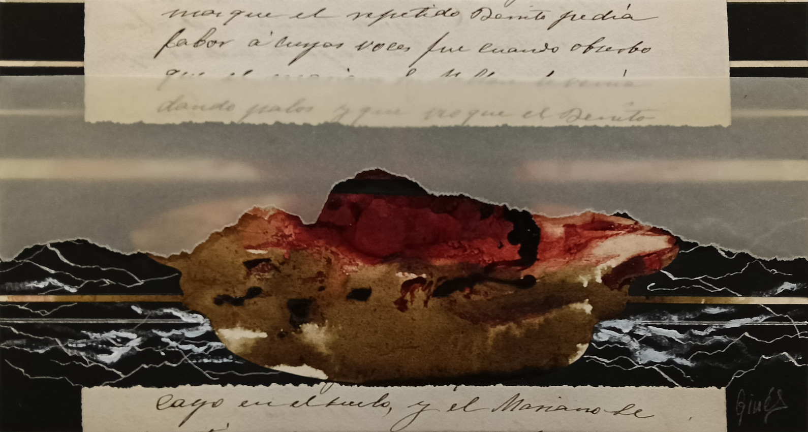 Obra de pequeño formato realizado mediante la técnica de COLLAGE, a base de papeles tintados, papel manuscrito original de principios del siglo XX, cartulinas y papeles varios