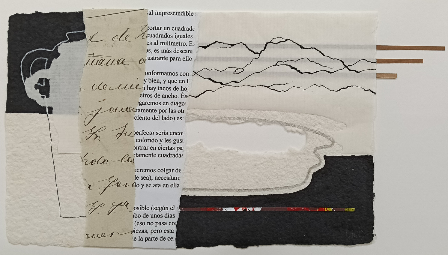 Obra de pequeño formato realizado mediante la técnica de COLLAGE, a base de papeles tintados, papel manuscrito original de principios del siglo XX, cartulinas y papeles varios
