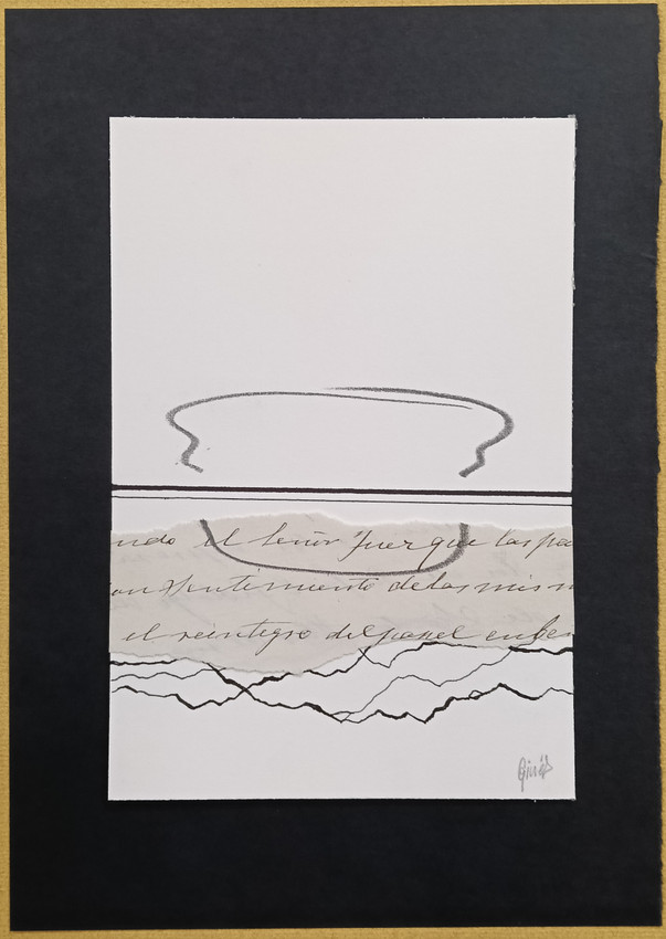 Obra de pequeño formato realizado mediante la técnica de COLLAGE, a base de papel manuscrito original de principios del siglo XX, cartulina grafito y tinta