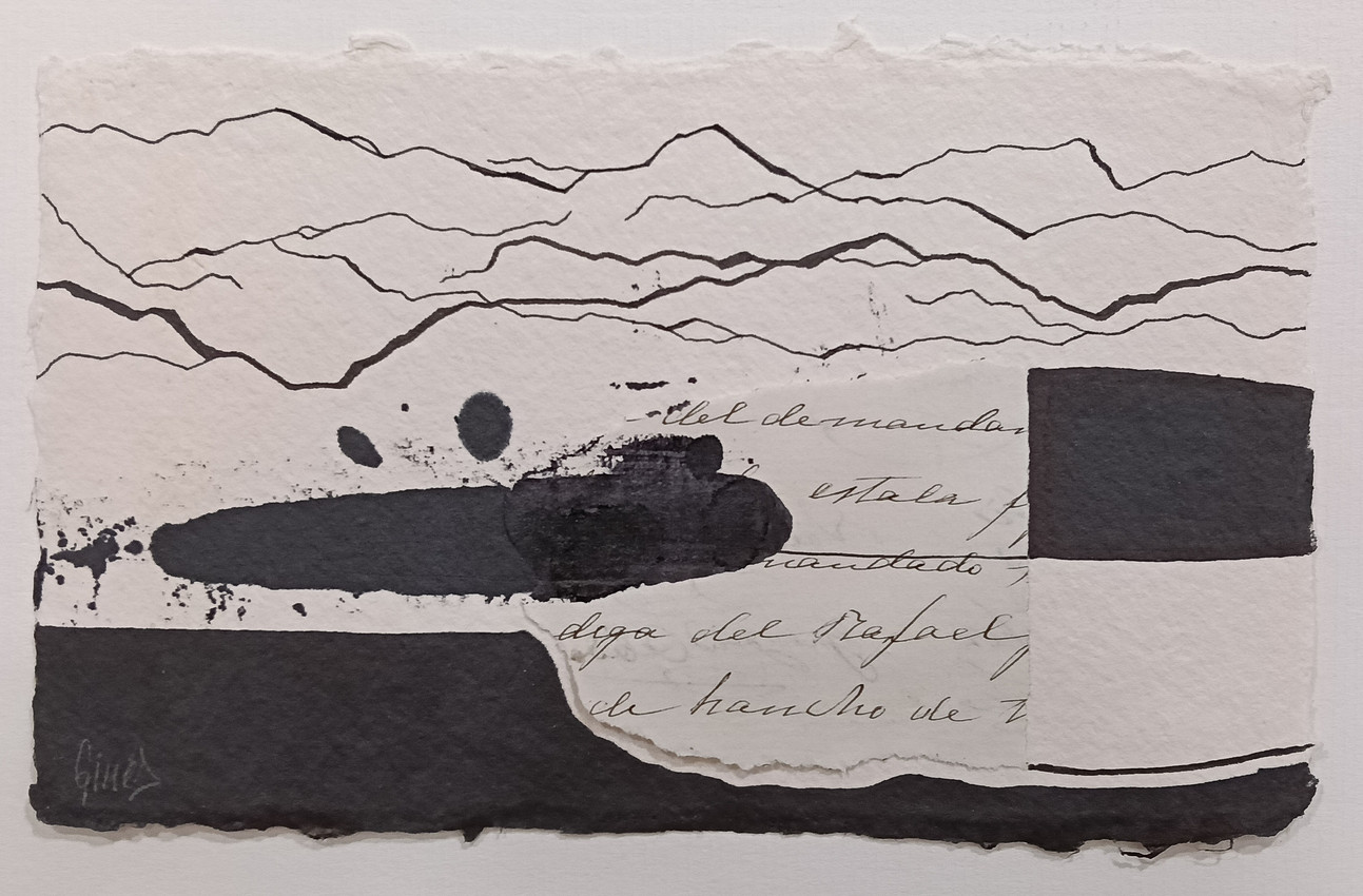 Obra de pequeño formato realizado mediante la técnica de COLLAGE, a base de papeles tintados, papel manuscrito original de principios del siglo XX, y tinta china.