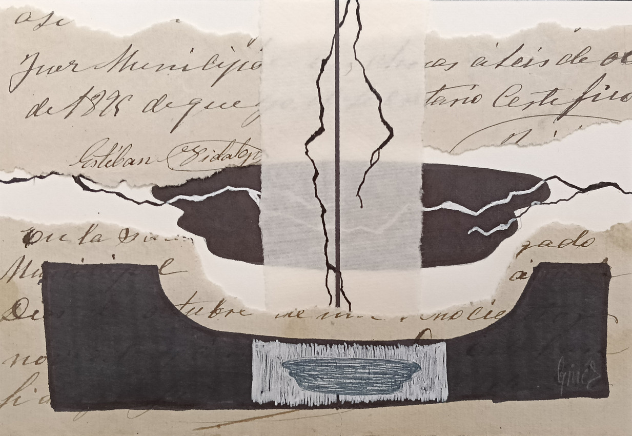 Obra de pequeño formato realizado mediante la técnica de COLLAGE, a base de papeles tintados, papel manuscrito original de principios del siglo XX, cartulinas y papeles varios