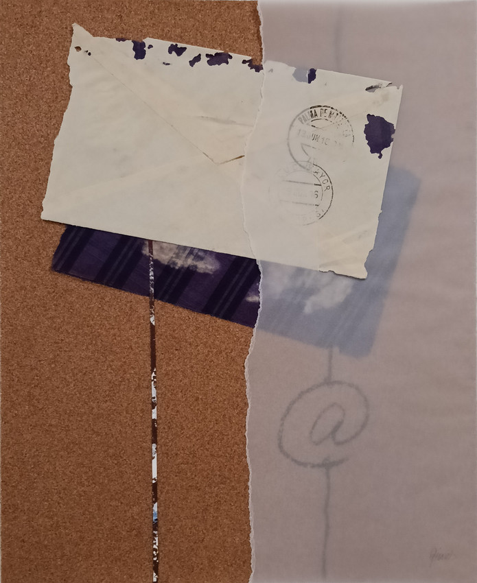 Collage de la colección "Mándame un e-mail, realizado mediante técnica mixta a base de papel de lija, papel manipulado y cartas originales de principios del siglo XX, algunas de finales del XIX.