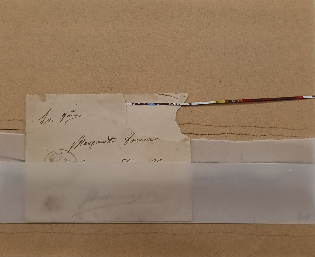 Collage de la colección "Mándame un e-mail, realizado mediante técnica mixta a base de papel de lija, papel manipulado y cartas originales de principios del siglo XX, algunas de finales del XIX.