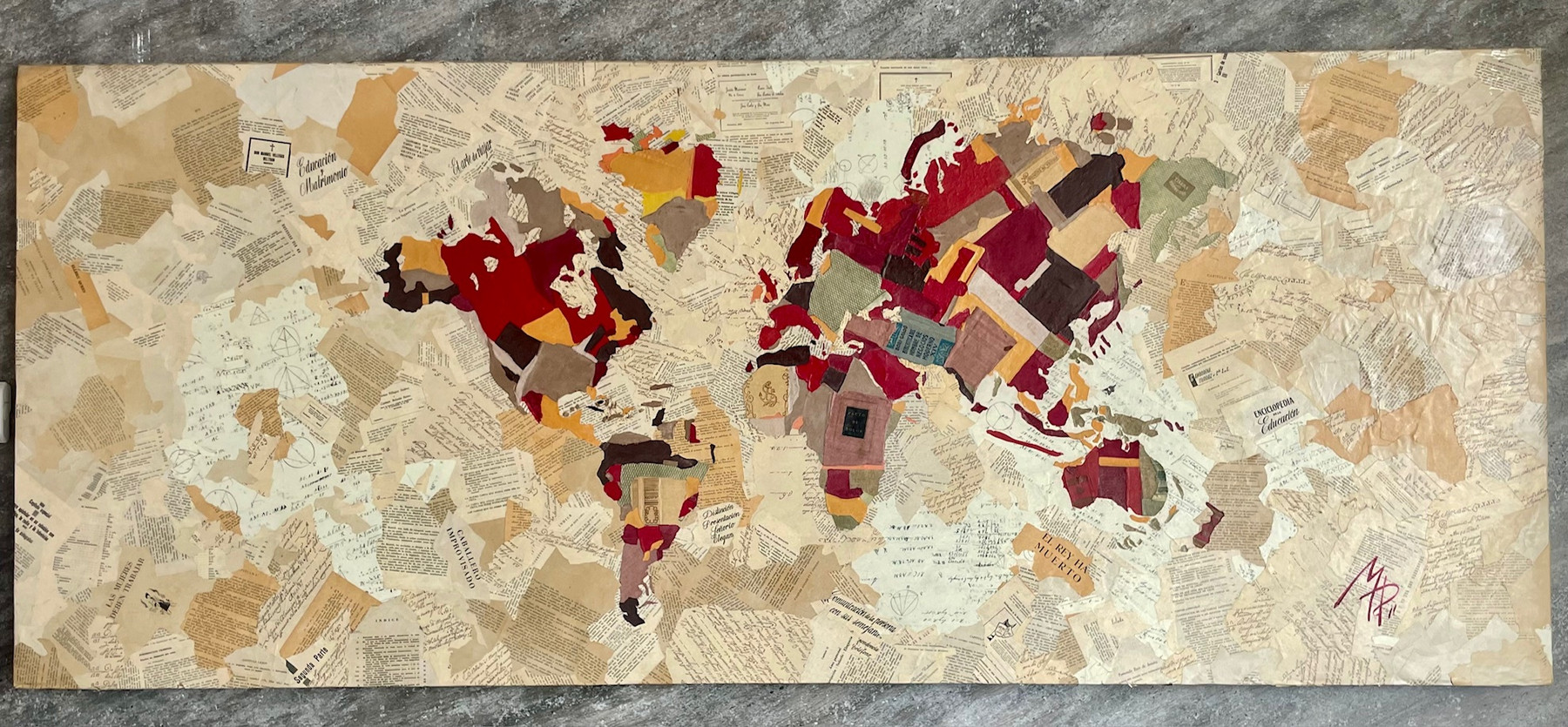 Es una obra creada con la técnica de collage sobre papel de libros antiguos, donde las tapas de estos libros se disponen formando un mapamundi. Este mapa no solo representa un espacio geográfico, sino también mi territorio personal e íntimo. En el océano que rodea los continentes, se integran mensajes escritos que reflejan los valores fundamentales que guían mi vida, invitando al espectador a navegar no solo por lugares, sino por significados profundos y la esencia de mi mundo interior.