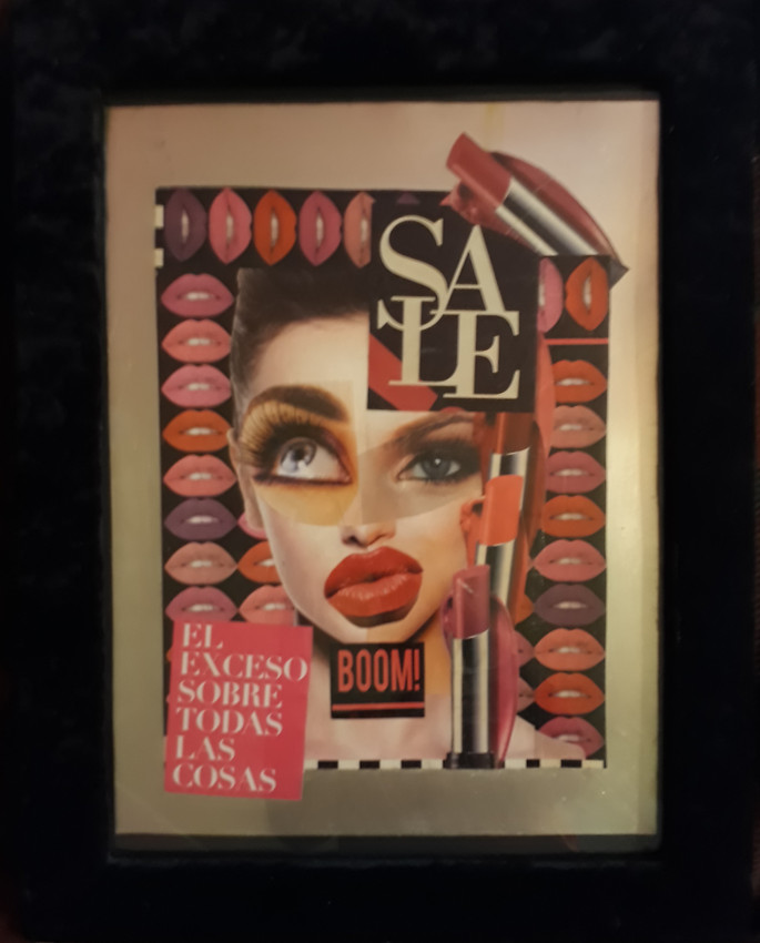 Collage realizado con recortes de publicidad en revistas, pegados en placas Offset. Marcos de cartón reciclado y textil.