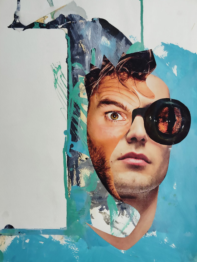 Created with acrylics, manipulated paper, and photography on fine art paper, it showcases a dynamic blend of contemporary and abstract expressionist styles. The artist skillfully layers these elements to evoke a sense of deep personal emotion, featuring a striking man's face at its core. The prominent use of blue enhances the artwork's introspective mood.