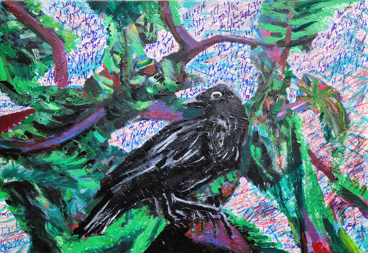 The artwork expresses the tension between free thought and constant evaluation in modern systems, where the individual struggles to make their voice heard amid the noise of assessments.