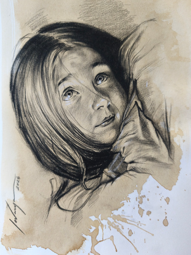 Retrato realista con carboncillos de una niña reflexiva, fondo sepia experimental logrado con café.