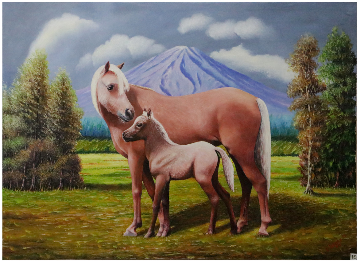 Descripción: Obra que representa una yegua en un paisaje ubicado a las faldas de un volcán, evocando fuerza, libertad y conexión con la naturaleza. La aplicación del óleo con técnica de espátula aporta textura, movimiento y profundidad visual.