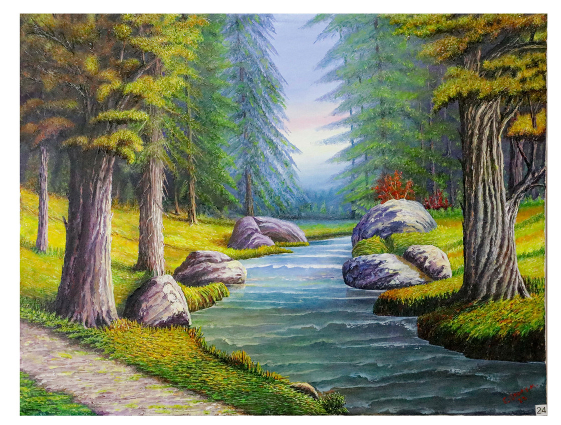 Descripción: Obra que representa un camino que conduce al interior del bosque, símbolo de recorrido, introspección y conexión con la naturaleza. La técnica de espátula aporta textura y movimiento al paisaje.