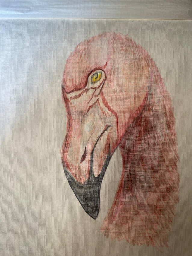 Dibujo flamenco Rosa con grande, en la fototgrafia se ve pequeño pero en la hoja es grande.