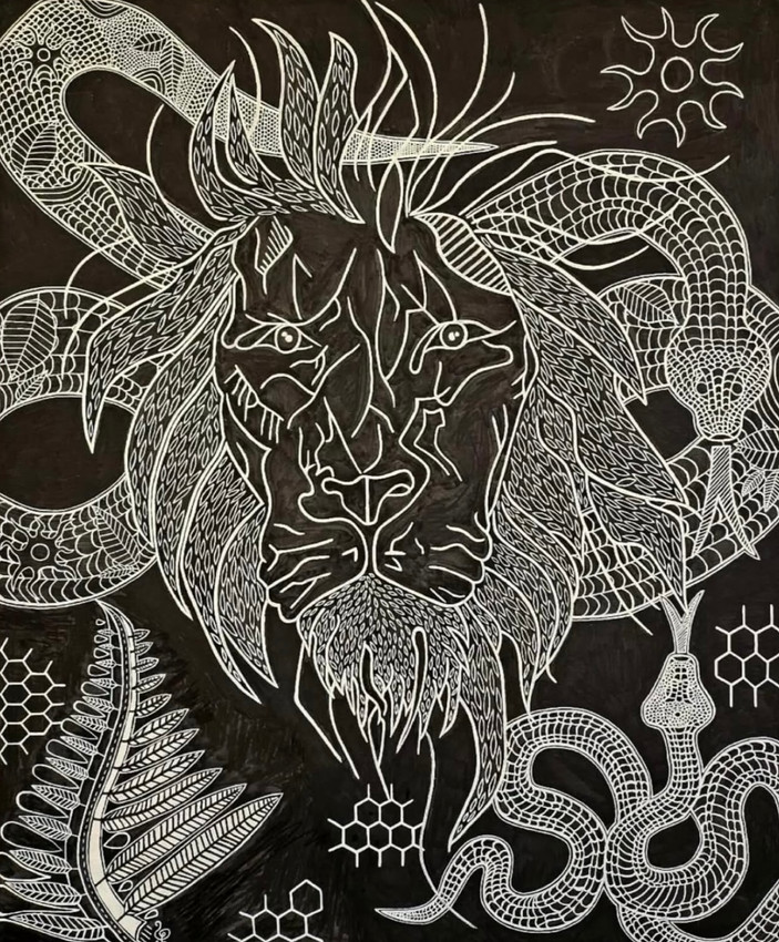 The contrast between the white lines and the dark background symbolizes the tension between light and shadow, consciousness and the unknown. The piece engages the viewer not only visually but also on an emotional and metaphysical level, confronting them with their inner power and fears.