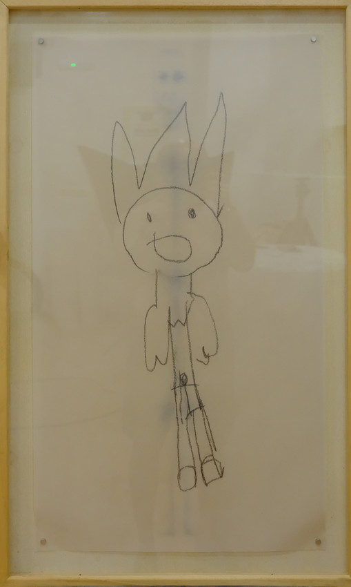 Obra realizada sobre tabla y papel. Sobre tabla dibujo realista de una figura masculina y sobre esta un dibujo realizado por mi hijo de la misma temática, jugando con la dualidad de la evolución del concepto de figura humana de un niño a un adulto.