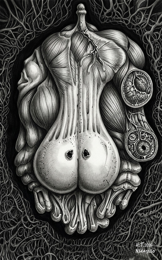 Esta impactante y compleja ilustración en blanco y negro ofrece una interpretación visceral de la lujuria como una compleja construcción anatómica y biomecánica. La composición central está dominada por una forma carnosa, casi bulbosa, densamente estriada por tejido muscular y redes vasculares. Esta forma central evoca tanto un corazón palpitante como, quizás de forma más provocativa, los genitales masculinos, con dos aberturas oscuras y bien definidas cerca de su base que recuerdan a órganos sensoriales o portales. Sobre ella, se extiende una estructura esquelética similar a una columna vertebral, que culmina en un único elemento fálico que apunta hacia arriba.