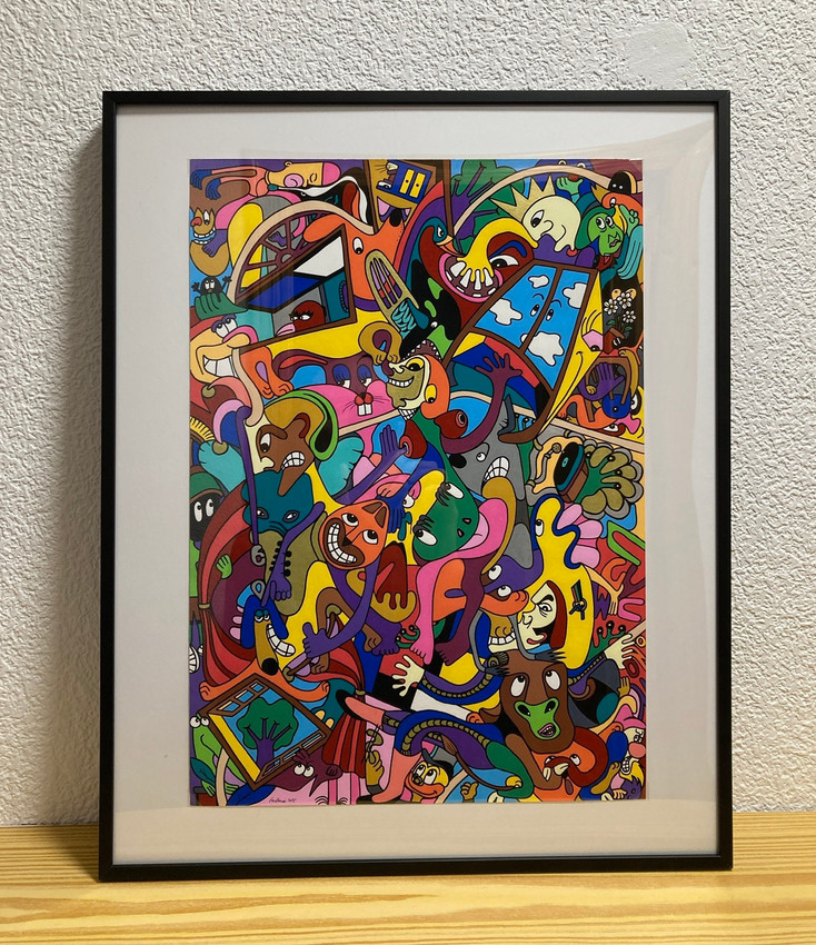 Dibujo enmarcado con un marco de aluminio y vidrio sintético.