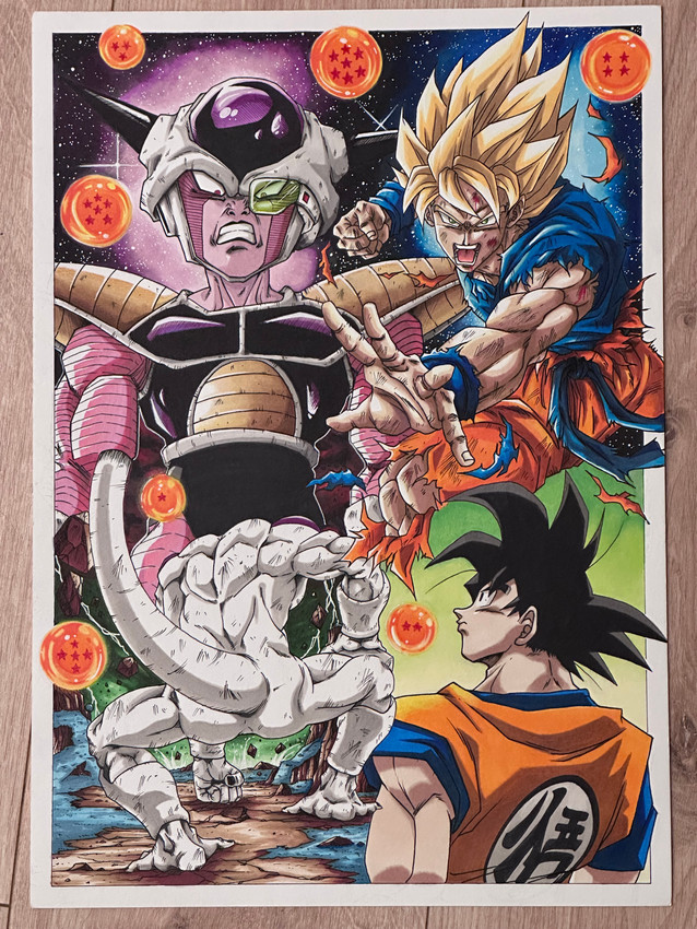 La composición muestra las diferentes etapas del combate y la evolución del poder de ambos guerreros, destacando el momento en que Goku alcanza por primera vez la forma de Super Saiyan.