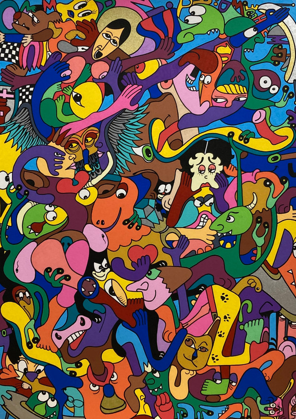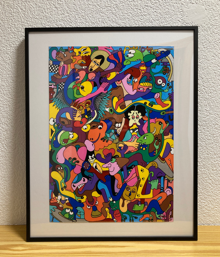 Dibujo hecho con rotuladores Posca sobre papel Canson de 250g en una hoja A3 . Obra original y única, hecha a mano desde la imaginación. Dibujo enmarcado con un marco de aluminio y vidrio sintético.