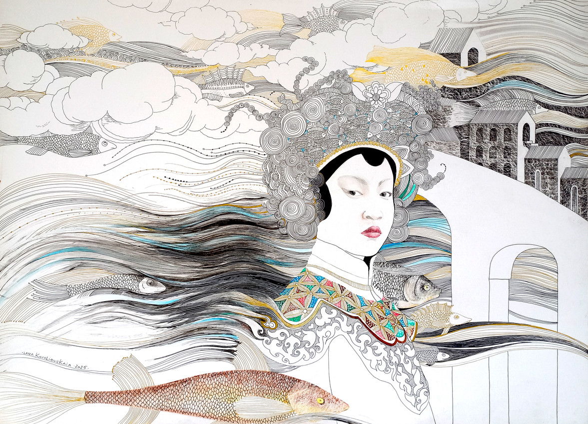 The work depicts a female figure intertwined with a natural element through the rhythm of lines and fluid graphic structures. The headdress of an Eastern beauty is woven from numerous fish. Waves transforming into clouds form a continuous stream in which the fish move — symbols of depth, memory, and inner knowledge. The half figure acts as a mediator between different levels of the world: water, sky, and earth. Her calm, focused gaze holds this multilayered reality in balance. Detailed graphics, delicate linework, and the choice of accent colors — gold, turquoise, and red — create a sense of quiet strength and constant movement. “Keeper of Currents” presents a guardian figure who maintains the connection between past and present, between natural and human realms. The work explores the idea of an inner current as a form of memory and as a state in which the world regains its wholeness.