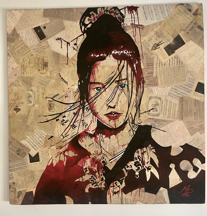 Combina la técnica del collage sobre hojas de libros antiguos como fondo con la pintura acrílica realista. En ella, una joven muestra lágrimas de sangre que caen de su boca, en una imagen dominada por blancos, negros, grises y rojos. El movimiento del cabello y los mechones que cubren parcialmente su rostro transmiten dinamismo y emoción. Destacan especialmente sus ojos azules, únicos en color, que penetran y generan una atmósfera inquietante, haciendo que la mirada sea el verdadero eco que resuena en el alma del espectador.