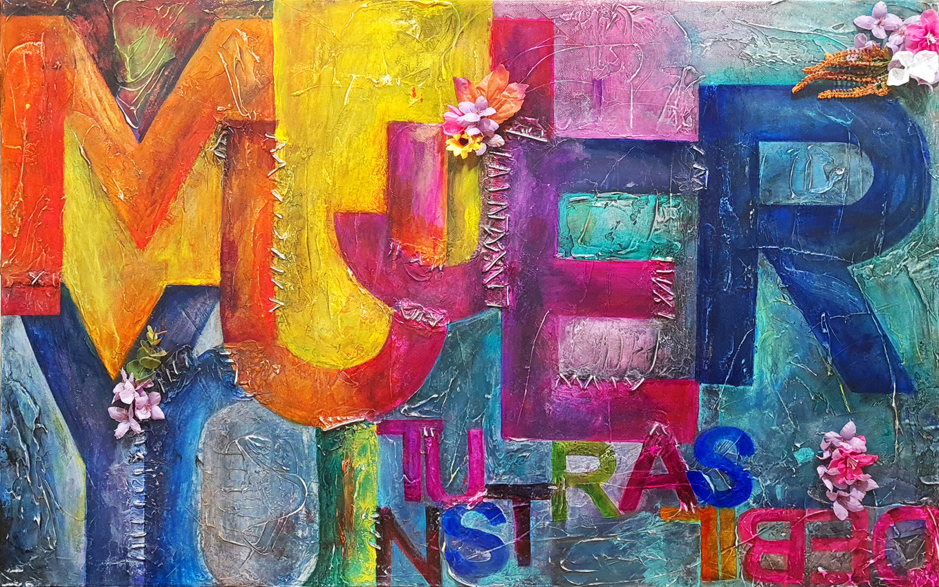 Esta obra es un homenaje a todas las mujeres. Las letras cosidas son cicatrices que han sanado, las flores son el renacer, hablan de una historia que no se grita, pero se lleva en la piel.