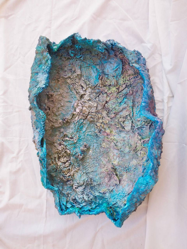 Anfíteres (2025) es una pieza donde la concha del nacimiento de Venus se reimagina como un universo marino creado por la mano humana. Su interior, construido con capas matéricas y materiales reciclados, evoca arrecifes y texturas submarinas en tonos azules e irisados. La obra juega con la paradoja entre lo natural y lo artificial, proponiendo un espacio simbólico donde la materia se transforma en vida y donde lo humano y lo marino conviven en equilibrio poético.