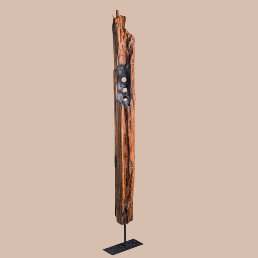 Con su imponente altura, esta pieza de traviesa de tren reciclada resalta por la interacción de sus colores naturales y las zonas quemadas y desgastadas por el tiempo. La escultura tiene un acabado tosco y fuerte, evocando la historia y la solidez de su material original, ahora transformado en arte.
