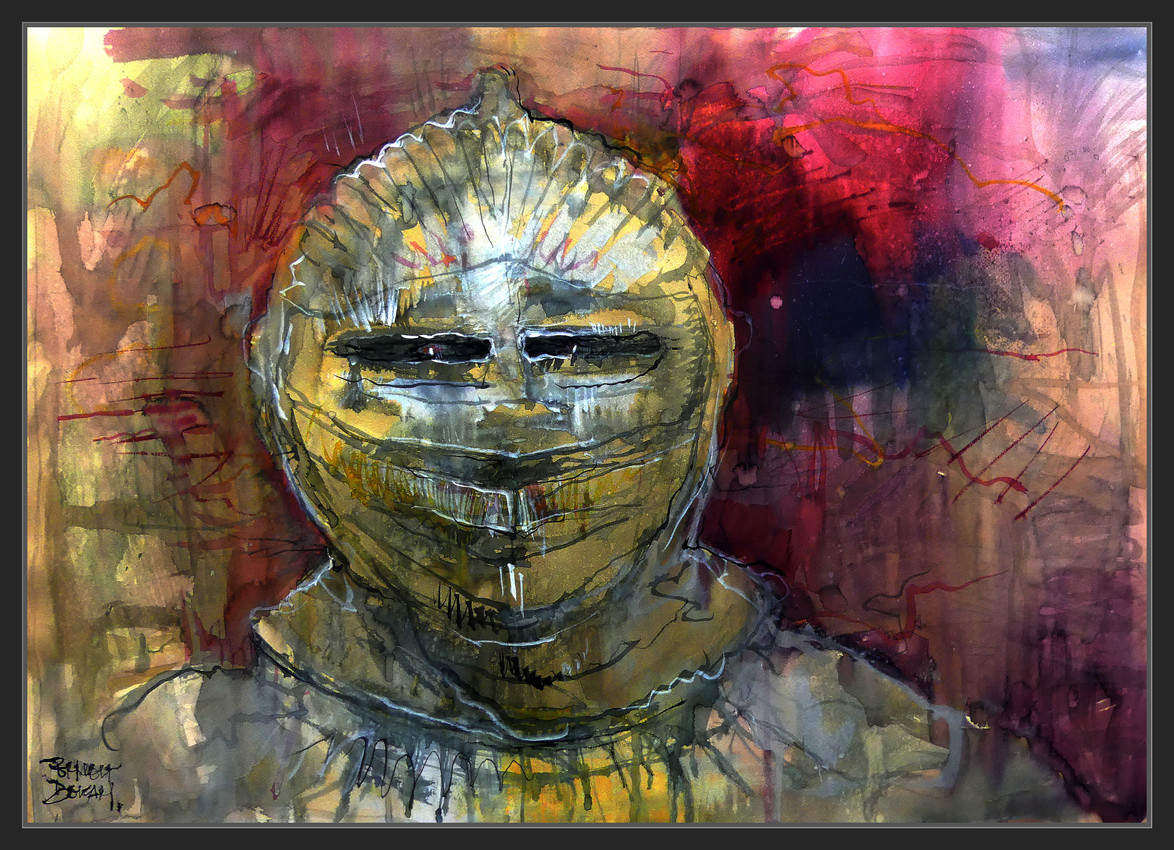 Espectaculares los distintos tipos de armaduras del Renacimiento, conjunto metálico con placas que cubre todo el cuerpo en las guerras de la epoca, hombres de hierro que imprimern miedo sólo al ver su impresionante presencia en batalla. El tiempo del renacimiento se conoce por sus adelantos técnicos y culturales pero es interesante para los amantes de la historia el recordar esta clase de caballeros. Pintura con acuarelas sobre papel de 50 x 70 centímetros del artista pintor Ernest Descals, Los asuntos militares siempre me han apasionado por ser reveladores de la genética humana. En esta obra me he centrado en la rendija para los ojos, todo lo demás está protegido.