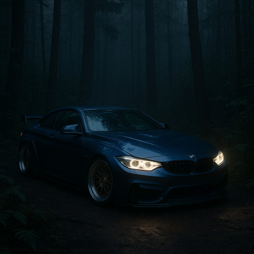 un bmw tuneado en mitad de un bosque perfecto para decorar tu cuarto.