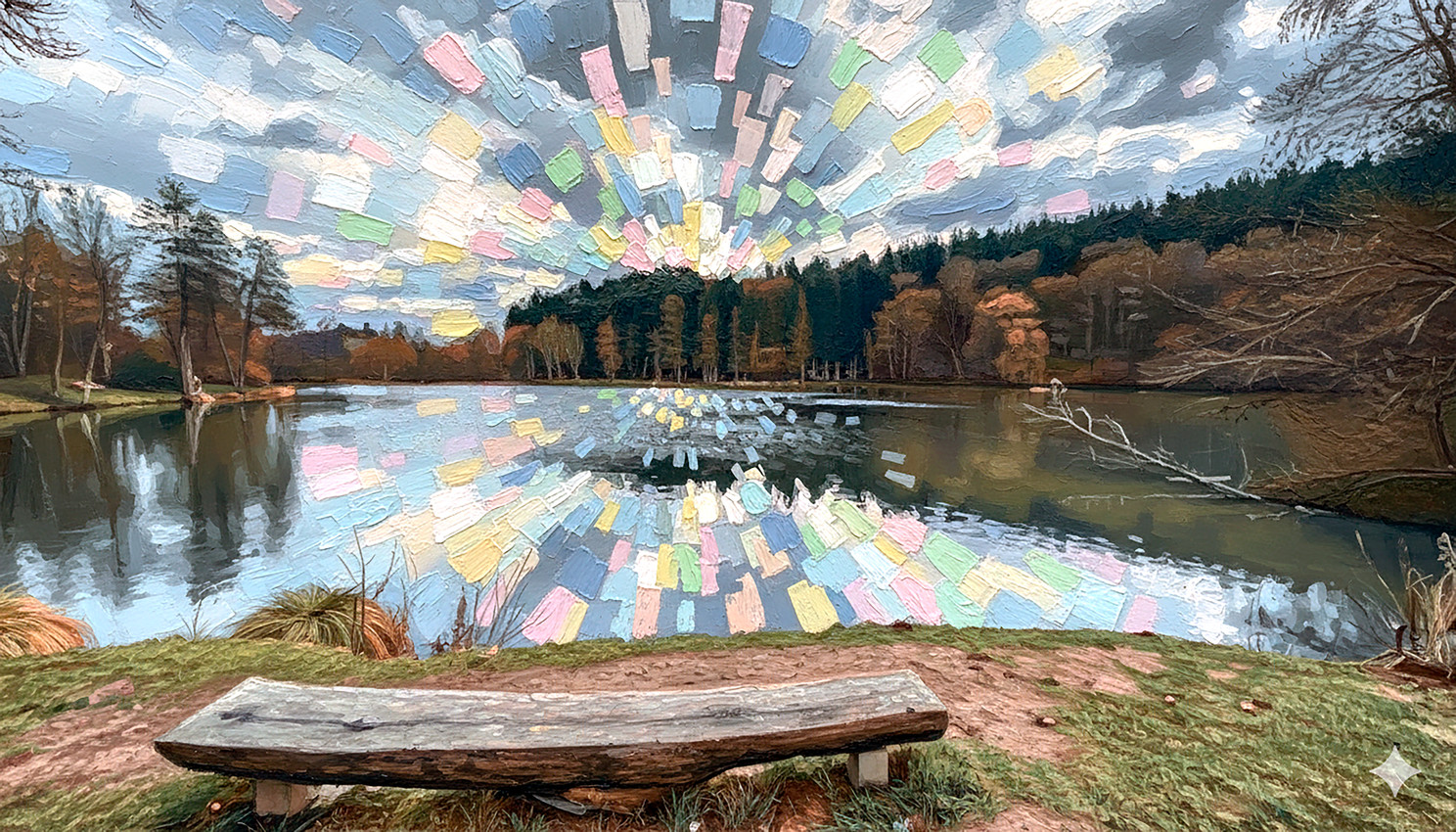 Fusión de estilos: el paisaje (banco, lago, bosque) está tratado con una sensibilidad realista, mientras que el cielo y su reflejo adoptan un lenguaje abstracto, casi geométrico, que recuerda al arte digital contemporáneo o a técnicas mixtas sobre lienzo.