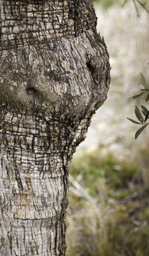 Fotografía que intenta jugar con la ambigüedad entre el nudo de un tronco de olivo, y el trasero de una persona. Se sirve firmada con rotulador oro.