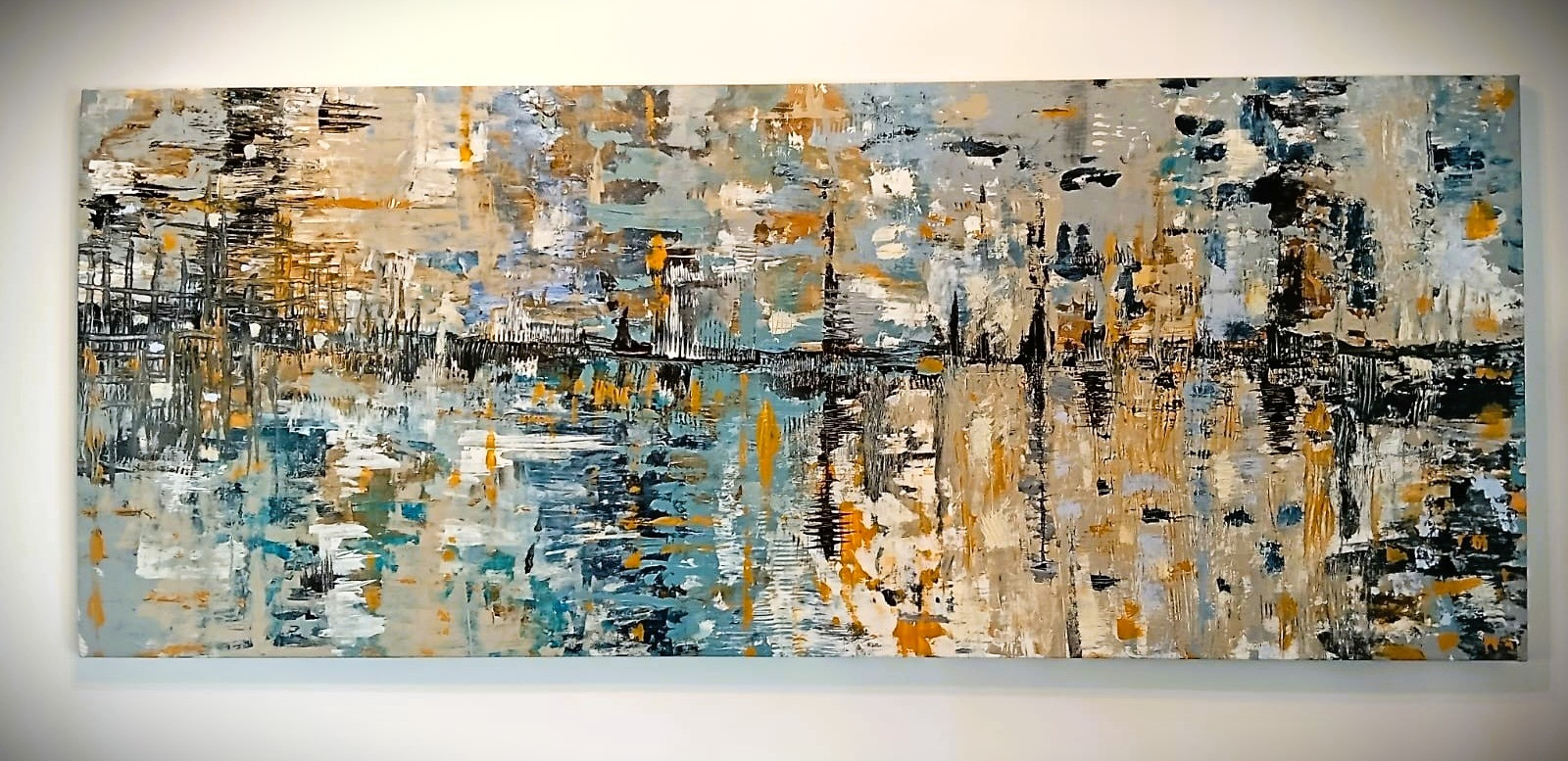 Obra abstracta con fuerte influencia de la técnica de espátula y pincel seco. La combinación de colores reflejan una sensación de profundidad, reflejo y movimiento