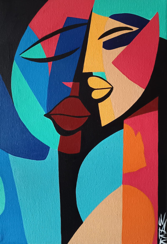 "Un retrato íntimo de dos almas unidas, donde la geometría transforma la realidad en sentimiento. El hombre, cimentado en bloques de azul profundo y sereno, se encuentra con la calidez vibrante de la mujer, compuesta por destellos de naranja, rojo y beige. Con los ojos cerrados, ambos personajes habitan un espacio abstracto de unión silenciosa, recordándonos que el amor y la conexión son estructuras geométricas de luz y color".