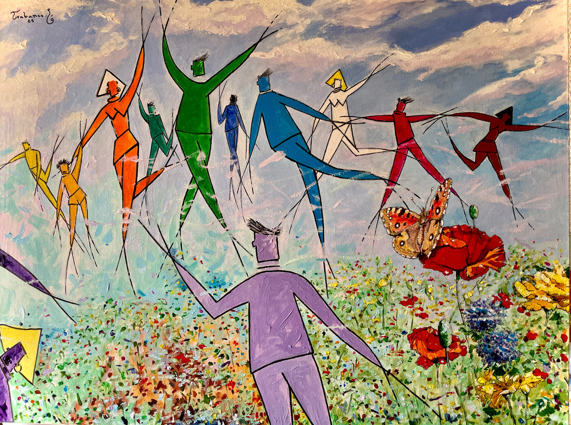 En esta vibrante pintura, Fernando Trabanco nos invita a un viaje lleno de color, movimiento y libertad. Las figuras estilizadas y dinámicas parecen flotar entre el cielo y un campo florido, formando una danza alegre que celebra la belleza de la vida.