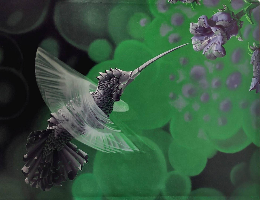 El punto focal de la pintura es un colibrí en pleno vuelo, representado con un detalle asombroso que lo transforma en una criatura casi biomecánica o blindada.