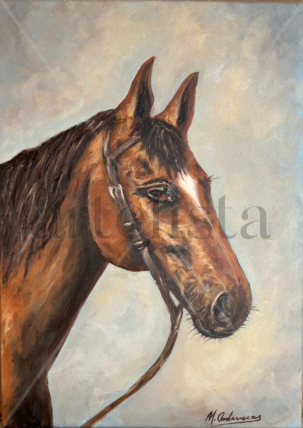 Óleo sobre lienzo (33×46 cm) que retrata con gran realismo la nobleza de un caballo en perfil. Colores cálidos, textura cuidada y firma del artista. Ideal para amantes del mundo ecuestre y la decoración rústica o clásica.