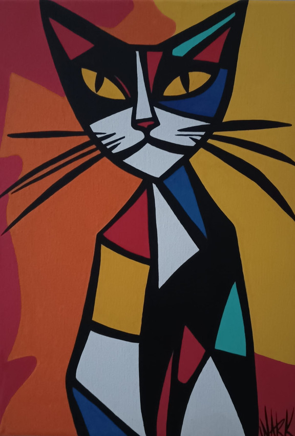 Una sinfonía de contrastes donde la oscuridad se encuentra con el fuego. "Onyx en llamas" presenta a un felino negro, sereno pero imponente, frente a un torbellino de colores primarios y cálidos. La pieza resalta la personalidad misteriosa del gato, transformándolo en un símbolo de protección y energía, con toques de color que brillan dentro de su pelaje oscuro.