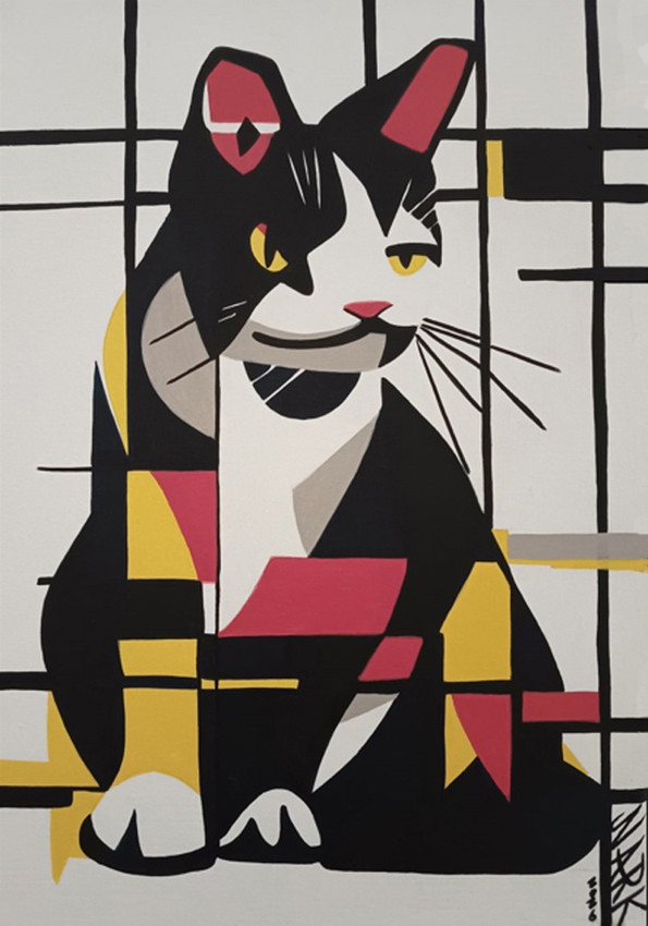 «En el corazón de la obra emerge una silueta felina que parece nacida de un prisma roto. No es un gato común, sino una criatura de geometría sagrada donde el negro absoluto se funde con fragmentos de un amarillo solar y un rojo incandescente, como si el animal contuviera el fuego y la luz en su interior. El azul profundo de su pelaje aporta una serenidad nocturna, un contrapunto de sombra que ancla su presencia en el lienzo.